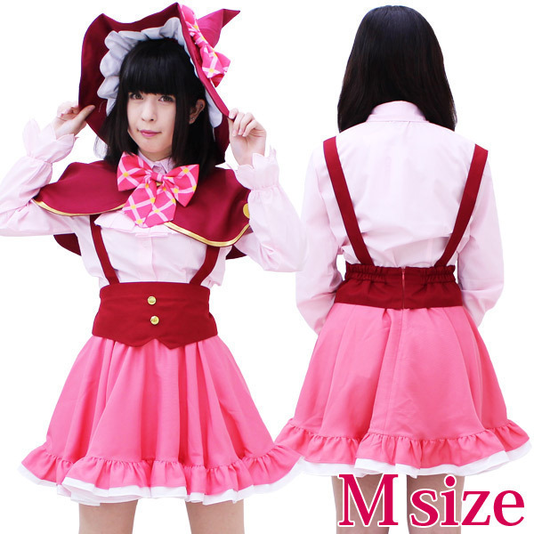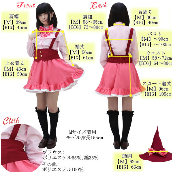 ●花びら風の袖口が可愛いブラウス●パステルピンクのフリルタイ付き●裾フリルたっぷりの吊りスカート●ウエスト後ろゴム&ファスナー●金模様も忠実に再現したケープ●チェック柄リボン付きとんがり帽子●首元用のおそろい柄リボンもセット。